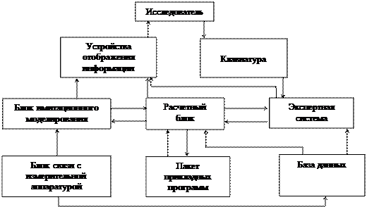 Блок связи с измерительной аппаратурой преобразует к нужному виду информацию, поступающую от измерительной аппаратуры. В базе данных хранится информация, поступившая из блока связи с измерительной аппаратурой, а также заранее введенная с целью обеспечения работоспособности системы. Расчетный блок, выполняя программы из пакета прикладных программ, производит все математические расчеты, в которых может возникнуть потребность в ходе научных исследований. Расчеты могут выполняться по требованию самого исследователя, или блока имитационного моделирования. При этом на основе математических моделей воспроизводится процесс, происходящий во внешней среде.