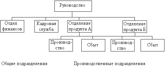 При использовании дивизионально-продуктовой структуры управления создаются отделения по основным продуктам. Руководство производством и сбытом какого-либо продукта (услуги) передаются одному лицу, которое является ответственным заданный тип продукции. Руководители вспомогательных служб подчиняются ему.