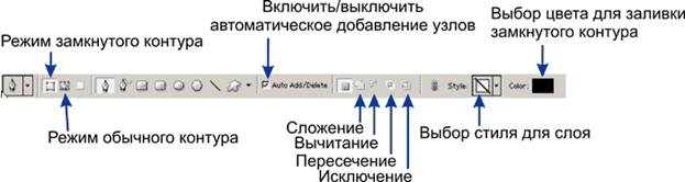 На панели отображается выбранный инструмент, затем идет кнопка, которая служит для переключения инструмента Пера в режим создания векторных форм. После нее отображена кнопка для переключения инструмента Пера в режим построения обычных контуров. Следующая, кнопка переключения в режим рисования растровых областей, заполненных основным цветом.