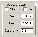 Переключатели Start и End задают наличие стартовой и конечной стрелки. В полях Width и Leigth указывается размер стрелок в процентах от толщины линии. Параметр Conсavity задаёт закругления основания стрелки.