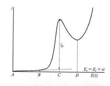 Рис. Вольтамперограмма при линейной развертки потенциала на электроде с постоянной плошадью поверхности.
