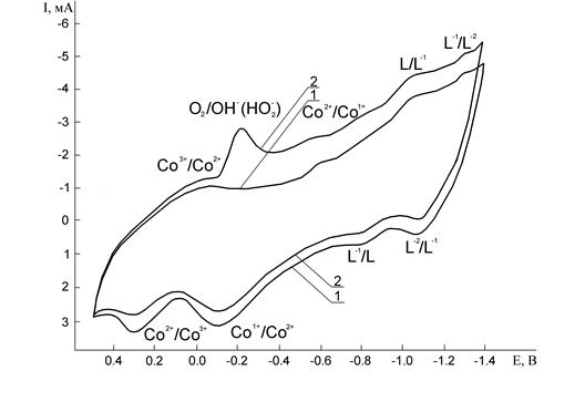 I-E-кривые для электрода с ТФП Со. V=20 мВ/с. Диапазон от 0.5 до -1.4 В.