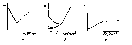 Электрическая проводимость сначала возрастает, а после прибавления избытка реактива остается постоянной, т.к. слабое основание мало изменяет общую электрическую проводимость раствора (рис.7, в).