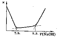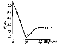 При титровании сильной кислоты сильным основанием (так же как и при титровании сильного основания сильной кислотой) электрическая проводимость раствора сначала падает (рис.7,а), так как ионы Н+ с большей подвижностью замещаются на катионы с меньшей подвижностью. За точкой эквивалентности дальнейшее прибавление основания (или кислоты) приводит к увеличению электрической проводимости, так как в растворе появляется избыток гидроксид-ионов с большей подвижностью. Восходящий за точкой эквивалентности участок кривой имеет меньший угол наклона по сравнению с нисходящим, так как подвижность гидроксид-ионов меньше подвижности ионов