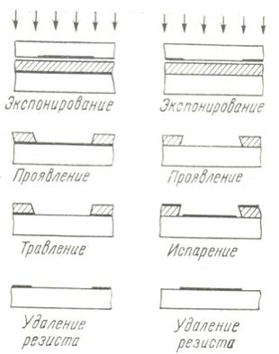 Появление фотолитографии оказало решающее влияние на развитие микроэлектроники, в частности, на разработку и промышленное освоение планарных технологий производства изделий микроэлектроники. Схема двух основных типов литографических процессов показана на Рис. 1.