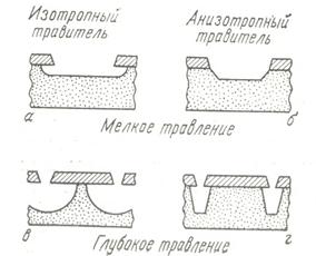 На Рис. 2 приведены схемы формирования структур при изотропном и анизотропном травлении для случаев глубокого и мелкого травления.