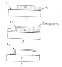 Приведенная на Рис. 3 схема соответствует следующим технологическим процессам: а – формирование разделительного слоя из никеля, осажденного электрохимически на проводящее металлическое покрытие; б – формирование консоли из пленки золота, осаждением через окна в фоторезисте; в - вытравливание никеля и формирование консольной структуры.