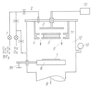 На Рис. 5 обозначено: 1 – игольчатый натекатель, 2 – вентиль, 3 – анод, 4 – катод, 5 – магнит, 6 – ионный пучок в кольцевом зазоре, 7 – обрабатываемая пластина, 8 – охлаждаемый держатель подложек, 9 – диффузионный насос, 10 – источник ВЧ – мощности, 11 – зона разряда, 12 – зона травления, 13 - ионизационный вакуумметр, 14 – заземление.