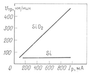 Рис. 6. Зависимости скорости травления и селективности травления s (SiO2/Si) от тока разряда в ионной пушке.