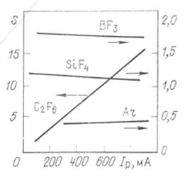 На рис. 6 в качестве примера приведены основные параметры устройства: зависимости скорости травления кремния и оксида кремния в C2F6 от тока разряда (Рис. 6 а) и значения параметра селективности травления s (SiO2/Si) в различных газах (Рис. 6 б).