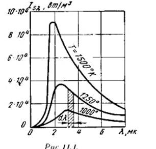 По мере увеличения длины волны энергия лучей возрастает, при некоторой длине волны достигает максимума, затем убывает. Кроме того, для луча одной и той же длины волны энергия его увеличивается с возрастанием температуры тела, испускающего лучи (рис.11.1).