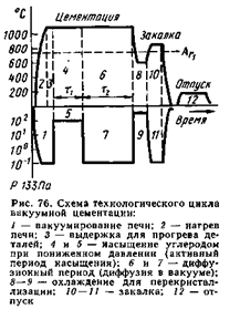 2. Диффузионный период (диффузия в вакууме). В этот период прекращают подачу газа в камеру и печь вакуумируют (рис. 76). В процессе выдержки при температуре насыщения происходит диффузия углерода вглубь, а концентрация его на поверхности достигает оптимальной (0,8—1,0 %).