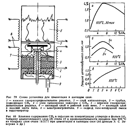 Установка состоит из генератора для получения эндогаза и рабочей зоны, где производится цементация. Как видно из рис. 79, через трубку 9 в эндогенератор, наполненный катализатором (ГИАП-3), поступает природный газ (метан) в смеси с воздухом (а = 0,26-О,27). В генераторе на газораспределительной решетке насыпается слой карборунда для улучшения подвода тепла от стенок в глубь катализатора. Рабочая зона заполнена корундом (размер частиц 100—120 мкм). Цементация проводится в атмосфере кипящего слоя, получаемого добавлением к эндогазу метана. Метан подводится через трубку 3. Узел смешивания эндогаза с метаном 4 располагается между генератором и цементационной зоной.