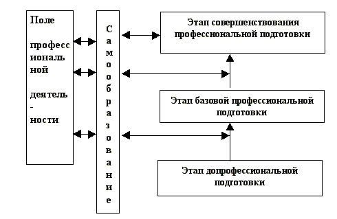 Употребляя в дальнейшем понятие "этап", имеем в виду стадию образовательного процесса, которая может совпадать или не совпадать с уровнем образования. Рассмотрим этапы непрерывной подготовки специалиста, приведенные на схеме 1. Каждый этап отличается своим содержанием, методами и формами организации обучения. Характерным отличием их от уровней образования является невозможность перехода человека через этап, – это принципиальный момент при разработке педагогических основ непрерывной подготовки специалистов.