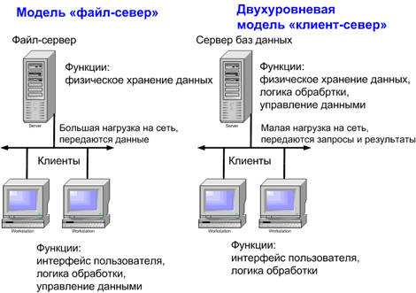 Приложение на рабочей станции "отвечает за все" - за формирование пользовательского интерфейса, логическую обработку данных и за непосредственное манипулирование данными. Файловый сервер предоставляет услуги только самого низкого уровня - открытие, закрытие и модификацию файлов. Обратите внимание - файлов, а не базы данных. Система управления базами данных расположена на рабочей станции.