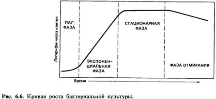 При изучении процесса размножения бактерий необходимо учитывать, что бактерии всегда существуют в виде более или менее многочисленных популяций, и развитие бактериальной популяции в жидкой питательной среде в периодической культуре можно рассматривать как замкнутую систему. Такое культивирование называется периодическим, при этом популяция проходит разные фазы своей жизни (Рисунок 6.6):