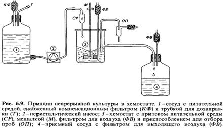 В периодической культуре условия все время меняются; плотность популяции бактерий возрастает, а концентрация субстрата уменьшается. Во многих физиологических исследованиях представляется, однако, желательным, чтобы клетки могли долгое время находиться в фазе экспоненциального роста при постоянной концентрации субстрата в неизменных прочих условиях. Приблизиться к такому положению можно, многократно и достаточно часто перенося клетки в новую питательную среду или в сосуд, содержащий популяцию растущих бактерий, непрерывно вводить новый питательный раствор и одновременно удалять из него соответствующее количество бактериальной суспензии. Именно такой метод положен в основу непрерывного культивирования в хемостатах и турбидостатах. Такой процесс выращивания микроорганизмов называется проточным культивированием (непрерывная культура).