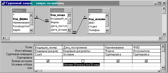 | Условие | Определяет условия отбора для поля, которое не участвует в группировке. |