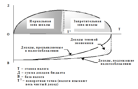 Значительный вклад в развитие неоклассической теории внес профессор А. Лаффер, который установил количественную зависимость между прогрессивностью налогообложения и доходами бюджета. Он построил параболическую кривую, получившую в дальнейшем название «кривая Лаффера» (см. рис.3.) Из рисунка отчетливо видно, что рост налоговых ставок только до определенного предела ведет к соответствующему увеличению бюджетных доходов. Превышая этот предел, налоговая ставка становиться тормозом для предпринимательской деятельности. В данной ситуации ликвидируются стимулы развития экономики, а доходы бюджета начинают сокращаться, поскольку сужается налоговая база.