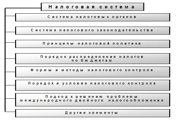Налоговая система (рис. 3.2.) представляет собойсовокупность предусмотренных налогов, принципов, форм и методов их установления, изменения или отмены, уплаты и применения мер по обеспечению их уплаты, осуществления налогового контроля, а также привлечения ответственности за нарушение налогового законодательства.