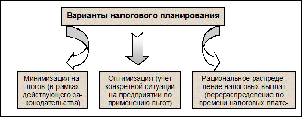 Налоговое планирование – условие легальной минимизации налогового бремени, должно производится на стадии бизнес - планирования, то есть до начала налогового периода. Варианты налогового планирования включают в себя: (рис.10.4.)