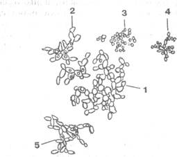 Дрожжи в пивоваренном производстве: 1-пивоваренные дрожжи (низовые); 2-другие виды сахаромицетов; 3 и 4-виды Torulopis; 5-микодерма