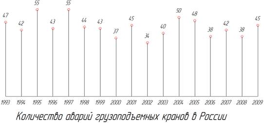 Соответственно велики цифры аварийности при эксплуатации кранов (рис. 2). Аварии на кранах ежегодно приводят к 90-100 смертельным исходам на производстве.