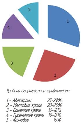 Самый высокий уровень смертельного травматизма составляет: на автокранах – 24 случая (24,5%), на мостовых кранах – 20 случаев (20%), на башенных кранах – 16 случаев (16%), на гусеничных кранах – 10 случаев (10%) и козловых кранах – 10 случаев (10%)