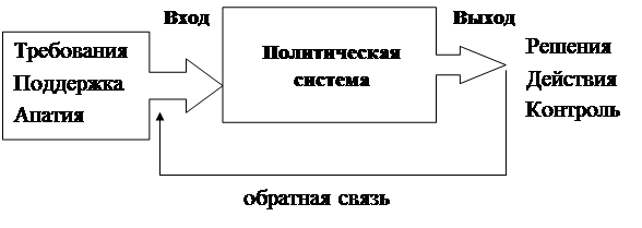 Процесс поступления и регистрации требований на "входе", преобразование (конверсия) их системой в решения и передача на выход с последующим контролем за реализацией – это и есть политический процесс. Политический процесс показывает, как возникают социальные требования, как они превращаются в общезначимые проблемы, а затем в предмет действия политических институтов, направленных на формирование общественной политики, на желаемое решение проблем. Системный подход помогает уяснить механизм формирования новых политических стратегий, роль и взаимодействие различных элементов системы в политическом процессе.