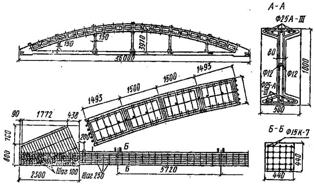 Двухшарнирная арка двутаврового сечения с предварительно напряженной затяжкой пролетом 36 м, изображенная на (рис. 1), собрана из шести блоков. Затяжку изготавливают в виде целого элемента с опорными блоками, что повышает надежность работы распорной конструкции. В качестве напрягаемой арматуры затяжки применяют канаты, натягиваемые на упоры. Блоки на монтаже соединяют сваркой либо выпусков арматуры, либо закладных деталей. Стыковые швы замоноличивают.