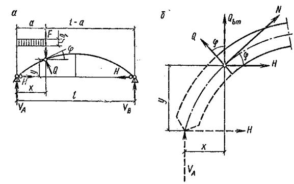 Усилия M, Q, N определяют определяют в нескольких сечениях по длине арки (рис. 2,б). Изгибающие моменты определяют по формуле (1), продольные и поперечные силы