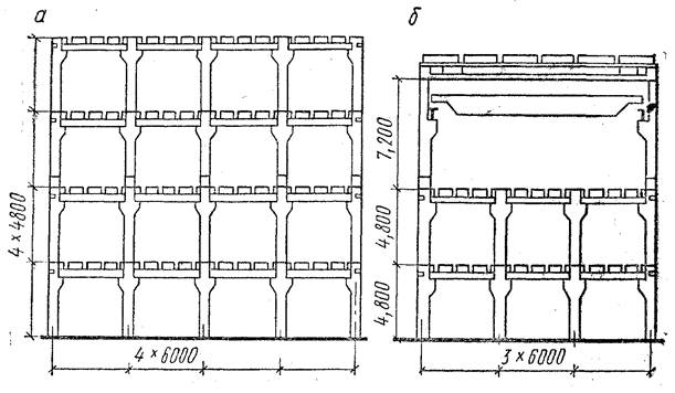 этажных рам с жесткими узлами — рамной системой, а в продольном — работой вертикальных стальных связей или же вертикальных железобетонных диафрагм, располагаемых по рядам колонн и в плоскости наружных стен, — связевой системой (рис. 2). Если в продольном направлении связи или диафрагмы по технологическим условиям не могут быть поставлены, их заменяют продольными ригелями. В этом случае пространственная жесткость и в продольном направлении обеспечивается рамной системой. При относительно небольшой временной нагрузке на перекрытия пространственная жесткость в обоих направлениях обеспечивается связевой системой; при этом во всех этажах устанавливают поперечные вертикальные диафрагмы. Шарнирного соединения ригелей с колоннами в этом решении достигают установкой ригелей на консоли колонн без монтажной сварки в узлах.