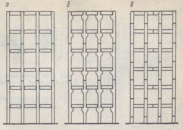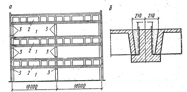 рам. Крайние стойки ферм вверху и внизу снабжены выступами для соединения с колоннами ниже- и вышележащих этажей. Плиты перекрытий в основных этажах — ребристые; их укладывают на верхний пояс ферм. Плиты перекрытий вспомогательных этажей— пустотные или ребристые; они опираются на полки нижнего пояса ферм (рис. 5, б).