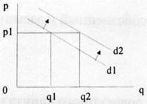 Рисунок 2 показывает возможность изменения спроса под воздействием, например, увеличения доходов покупателей. Вначале он был в объеме 0q1, затем стал 0q2 при прежней цене 0р1.
