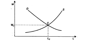 Равновесная ставка заработной платы и равновесный уровень занятости данного вида труда определяются на пересечении кривых предложения и спроса на труд (в точке С).