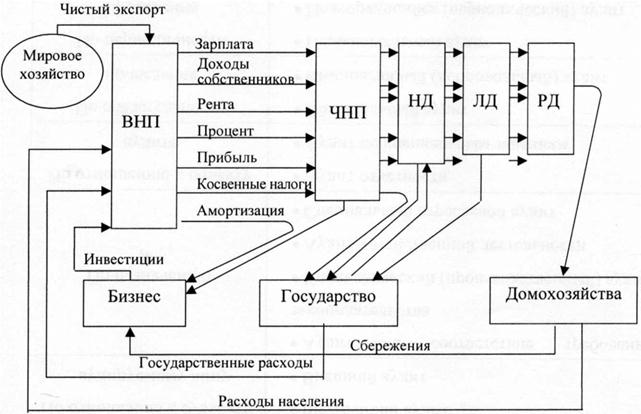 Схема последовательно отражает все рассмотренные ранее стадии распределения ВНП. На ней представлены три основных субъекта национальной экономики, принимающие участие в его формировании: фирмы, домохозяйства, государство и зарубежные субъекты. Хорошо видно, что ВНП предстает как совокупность доходов и расходов, так что схема является моделью кругооборота доходов и расходов.