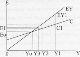 Сокращение производства происходит до тех пор, пока не установится равенство между совокупным спросом и предложением (0Ео=0Yо). Становится очевидным, что кризис необходим, чтобы восстановить это нарушенное равенство.