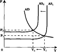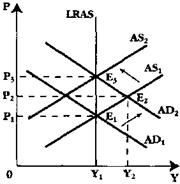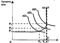 Графически расширение совокупного спроса выразится в сдвиге AD1 до AD. В результате реальное производство вернется на прежний уровень Υ1, но цены повысятся до уровня Р3