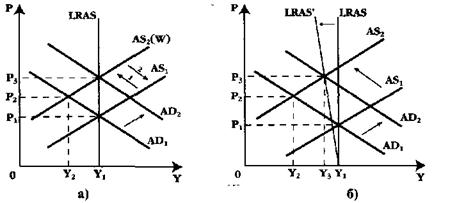 а) Кривая совокупного предложения в долгосрочном плане LRAS изображена вертикальной линией, так как реальный выпуск, сократившийся в краткосрочном плане до Y2, восстанавливается в долгосрочном плане до прежнего уровня Υ1