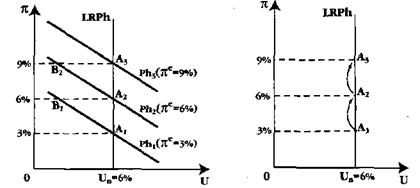 На рис. 7а. эта адаптация показана перемещением из точки В1 в точку А2вследствие сдвига краткосрочной кривой Филлипса в новое положение Ph2. Если профсоюзы и правительство будут продолжать бороться за сокращение естественною уровня безработицы теми же методами, то повторится аналогичная история, но уже при более высоком уровне инфляции. Безработица сократится на время, пока ожидаемая инфляция ниже ее фактического уровня. Произойдет аналогичное перемещение вдоль краткосрочной кривой Филлипса, из точки А2 в точку В2. В точке В 2 ожидаемая инфляция составляет 6%, а фактическая уже 9%. Но как только «ложные» инфляционные ожидания (не соответствующие фактической инфляции) будут скорректированы, безработица снова вернется к естественному уровню 6%, но уже при более высоких темпах инфляции (9%). Итак, в долгосрочном плане экономика будет перемещаться из точки А1 в точку А2 затем в точку А3 и т. д., что и объясняет вертикальное положение долгосрочной кривой Филлипса LRPh, полученной соединением этих точек.