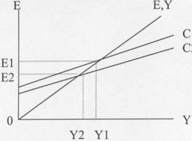 На рисунке линия С1 представляет функцию потребления без налога, линия С2 –функцию потребления с налогом. Видно, что при данном совокупном доходе 0Y1 без налога потребление и, соответственно, спрос (0Е1) больше, чем с налогом (0Е2).