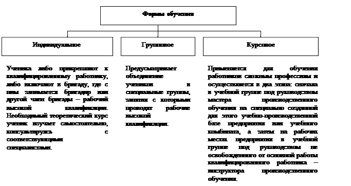 Выбор конкретных форм организации подготовки работников российское законодательство предоставляет самим организациям, которые могут для этого создавать учебные центры, а также заключать договоры на обучение с профессионально-техническими учебными заведениями или учебными центрами. Производственное обучение во всех случаях должно завершаться на рабочих местах данного предприятия, которое разрабатывает и утверждает учебные планы и программы. Теоретическое обучение при курсовой и групповой подготовке осуществляется в учебных группах, в учебных комбинатах (пунктах) и на специальных курсах.