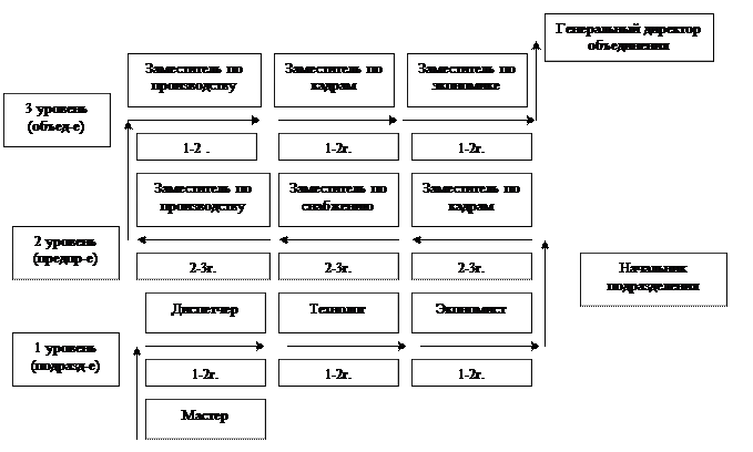 Модель карьеры «змея» пригодна для руководителя и специалиста. Она предусматривает горизонтальное перемещение работника с одной должности на другую путем назначения с занятием каждой непродолжительное время (1-2г.). Например, мастер после обучения в школе менеджеров работает последовательно мастером, технологом и экономистом, а затем назначается на должность начальника цеха. Это дает возможность линейному руководителю более глубоко изучить конкретные функции управления, которые ему пригодятся на вышестоящей должности.