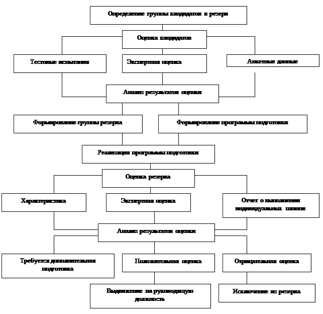 Процесс формирования резерва и работа с ним включает определение его численности, должностной структуры, изучение, оценку (экспертный лист), отбор кандидатов, составление и утверждение списка, организацию повышения квалификации. (см. рисунок 6.10)
