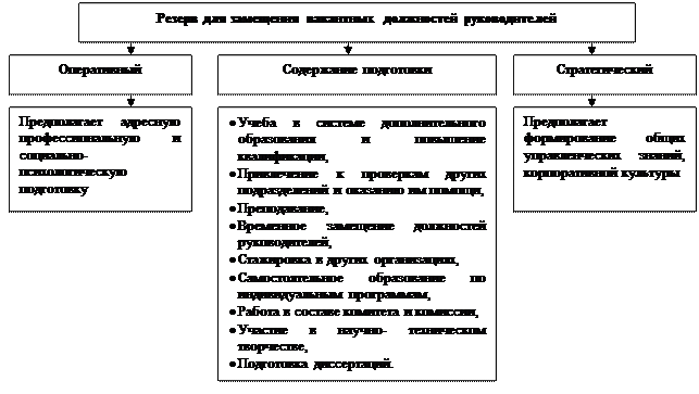 Должностная структура резерва строится по трем уровням управления — высшему, среднему и низшему в соответствии с утвержденной номенклатурой должностей. Требования к претендентам (компетенция, личные качества, знания) формулируются с учетом специфики их будущих должностей и особенностей организации.