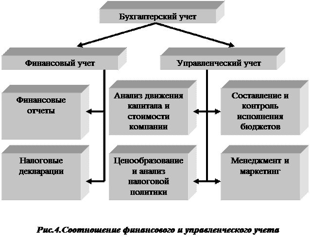 И финансовый, и управленческий учет представляют собой виды бухгалтерского учета, но первый ориентирован в основном на внешних пользователей, а второй - на внутренних. Задачи их несколько различны (рис.4):