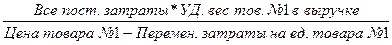 Если выпускается несколько товаров (т.е. многономенклатурное производство), то объем производства, обеспечивающий безубыточность конкретного товара (например, товара №1), определяется по формуле, которая учитывает удельный вес этого товара в общей выручке от реализации.