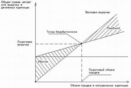 Объем производства, при котором прибыль равна нулю, называется критическим объемом производства, а точка, в которой это достигается – точкой безубыточности (ТБ) или порогом рентабельности (ПР). точка безубыточности – это стоимостной показатель, а порог рентабельности имеет натуральные единицы измерения.
