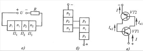 Так как коллекторный p-n- переход смещен в обратном направлении, то определенного значения напряжения почти всё приложенное напряжение падает на нем. Такая структура легко моет быть представлена в виде двух транзисторов разной электропроводности, соединенных между собой так, как показано на рис. 2, б, в.