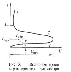 Носители заряда, появившиеся в областях вследствие инжекции и лавинного размножения, приводят к уменьшению сопротивления всех областях динистора, и падение напряжения на приборе становится незначительным. На вольт-амперной характеристике этому процессу соответствует участок 2 с отрицательным дифференциальным сопротивлением (рис. 3). После переключения воль-амперная характеристика аналогична ветви характеристики диода, смещенного в прямом направлении (участок 3). Участок 1 соответствует закрытому состоянию динистора.